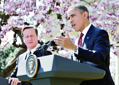 圖為奧巴馬(右)與卡梅倫在聯(lián)合記者會(huì)上發(fā)表講話。