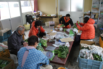 “北釜耕人會(huì)”的災(zāi)民包裝收獲的小松菜。記者 何德功 攝 |