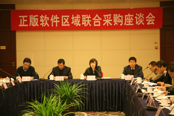 圖為財政國庫司政府采購辦公室主任王瑛(左三)、中央國家機(jī)關(guān)政府采購中心主任王力達(dá)(左二)在正版軟件區(qū)域聯(lián)合采購座談會上。資料照片 |