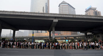 圖為一些北京CBD的上班族下班后在國(guó)貿(mào)橋下排隊(duì)等候回家的公共汽車。記者 羅曉光