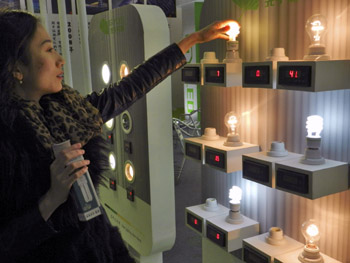 觀眾在2012中國(北京)國際照明展覽會上體驗節(jié)能燈與普通燈的區(qū)別。新華社發(fā) |