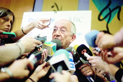 據(jù)外媒報(bào)道,西班牙央行行長(zhǎng)奧德內(nèi)茲(Miguel Angel Fernandez Ordonez)周二(4月10日)在馬德里的一場(chǎng)會(huì)議上說:“如果西班牙經(jīng)濟(jì)比預(yù)期更為惡化,繼續(xù)給銀行增加資本金將是必要的”。他表示,西班牙經(jīng)濟(jì)不可能在短期內(nèi)強(qiáng)勁反彈。相關(guān)報(bào)道稱,西班牙經(jīng)濟(jì)今年正在走入衰退,政府預(yù)計(jì)經(jīng)濟(jì)將萎縮1.7%。 圖為奧德內(nèi)茲在接受媒體采訪。