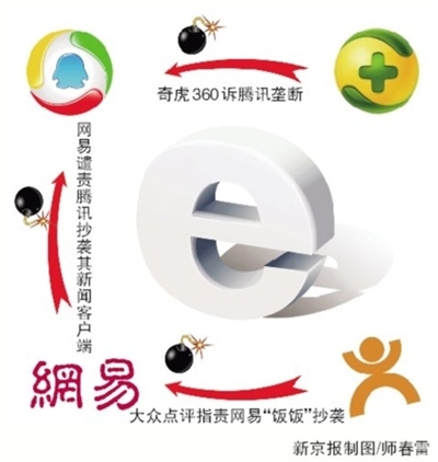 網(wǎng)易指責(zé)騰訊抄襲其新聞客戶端產(chǎn)品風(fēng)波未平,網(wǎng)易自家卻“后院起火”。大眾點(diǎn)評網(wǎng)昨日宣布,網(wǎng)易于近日上線的移動(dòng)客戶端“飯飯”大量抄襲來自大眾點(diǎn)評網(wǎng)的內(nèi)容,大眾點(diǎn)評網(wǎng)要求其立即停止抄襲、并做下架處理。此外,由于奇虎360訴騰訊壟斷的案件將于4月18日在廣東高院開庭審理,所以“三國殺”已演變?yōu)椤八膰髴?zhàn)”。