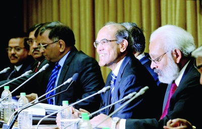 印度央行17日將短期借貸利率下調(diào)0.5個百分點至8%,這是印度三年來首次下調(diào)基準利率。 印度央行行長蘇巴拉奧說,央行下調(diào)基準利率主要是因為印度經(jīng)濟增速放緩,通貨膨脹形勢得以緩解。 圖為蘇巴拉奧(右二)當天在貨幣政策會議上講話。