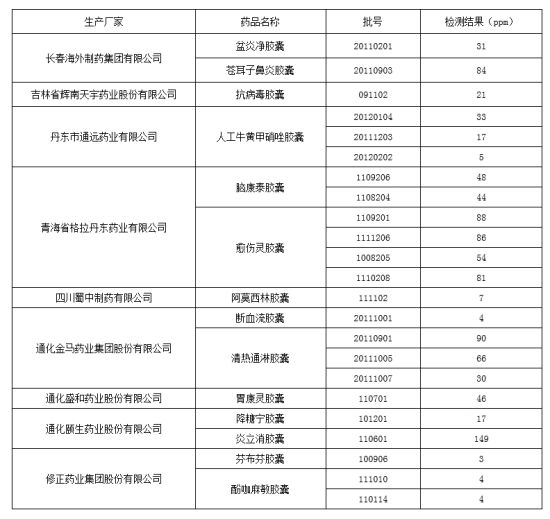 第一批檢驗主要針對媒體曝光的9家藥品生產(chǎn)企業(yè),共抽驗33個品種42個批次,其中23個批次不合格。檢驗結(jié)果表明,長春海外制藥集團(tuán)有限公司、青海格拉丹東藥業(yè)有限公司、丹東市通遠(yuǎn)藥業(yè)有限公司、吉林省輝南天宇藥業(yè)股份有限公司、四川蜀中制藥有限公司、修正藥業(yè)集團(tuán)股份有限公司、通化金馬藥業(yè)集團(tuán)股份有限公司、通化盛和藥業(yè)股份有限公司、通化頤生藥業(yè)股份有限公司等企業(yè)有的批次產(chǎn)品使用的膠囊鉻含量超過國家藥典限量標(biāo)準(zhǔn)。上述企業(yè)未按藥品生產(chǎn)質(zhì)量管理規(guī)范組織生產(chǎn),使用了不符合國家藥典標(biāo)準(zhǔn)的膠囊,產(chǎn)品質(zhì)量不合格。