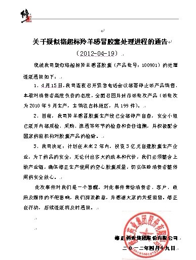 4月19日,修正藥業(yè)就公司疑似鉻超標(biāo)羚羊感冒膠囊(產(chǎn)品批號:100901)的處理進(jìn)展發(fā)布通報(bào),表示對羚羊感冒膠囊生產(chǎn)線已全部停產(chǎn)自查,并積極配合國家藥監(jiān)機(jī)構(gòu)對膠囊產(chǎn)品的檢驗(yàn)。修正藥業(yè)表示,計(jì)劃在未來2年內(nèi),投資3億元自建膠囊生產(chǎn)企業(yè),切實(shí)保障消費(fèi)者整體用藥安全放心。通報(bào)全文附后。
