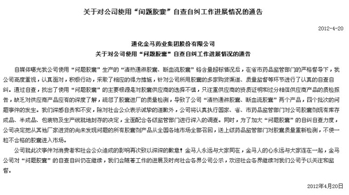 圖為4月20日通化金馬藥業(yè)在其網(wǎng)站上公布的“問題膠囊”自查通告