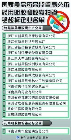 據(jù)國家食品藥品監(jiān)督管理局網(wǎng)站消息,按照企業(yè)全覆蓋、品種全覆蓋、產品批次隨機抽樣的原則,國家食品藥品監(jiān)管局在全國范圍內對藥用明膠和膠囊生產企業(yè)進行了全面排查,對18家藥用明膠生產企業(yè)抽驗了166批明膠,檢出1批產品鉻超標;對117家藥用膠囊生產企業(yè)抽驗了941批藥用膠囊,檢出15家企業(yè)74批膠囊鉻超標,不合格率為7.9%。