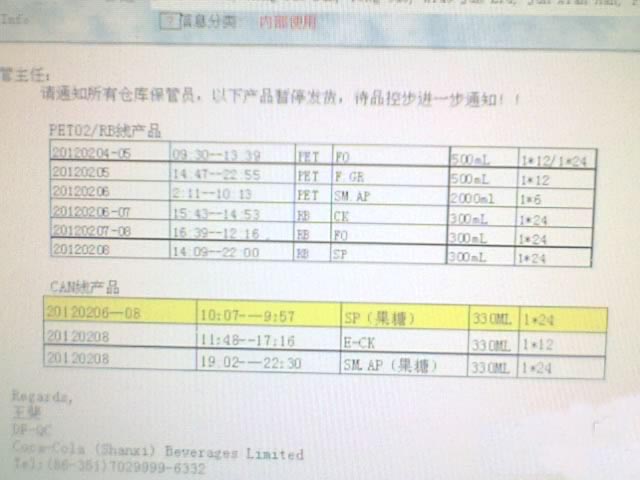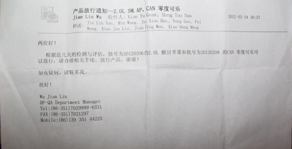可樂公司內(nèi)部郵件截屏:公司對存疑產(chǎn)品放行的郵件