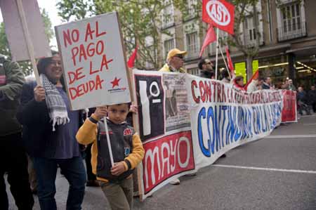 5月1日,在西班牙馬德里,一名兒童參加游行。 當(dāng)日,西班牙首都馬德里舉行大規(guī)模群眾游行集會(huì),抗議政府削減教育及醫(yī)療保障開(kāi)支,并呼吁政府加大力度解決就業(yè)問(wèn)題,數(shù)萬(wàn)名群眾參與集會(huì)。受經(jīng)濟(jì)危機(jī)影響,西班牙政府采取一系列緊縮措施,削減財(cái)政支出,以減少赤字。