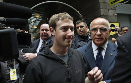 美國著名社交網(wǎng)站“臉譜”公司(Facebook)當(dāng)?shù)貢r(shí)間7日在紐約正式開始路演。根據(jù)首次公開募股(IPO)定價(jià),“臉譜”計(jì)劃募集最多118億美元,這將超過以往任何一家互聯(lián)網(wǎng)公司的IPO規(guī)模。 圖為“臉譜”公司首席執(zhí)行官馬克·扎克伯格當(dāng)日在安全人員的護(hù)衛(wèi)下離開進(jìn)行宣傳活動(dòng)的美國紐約市喜來登酒店。