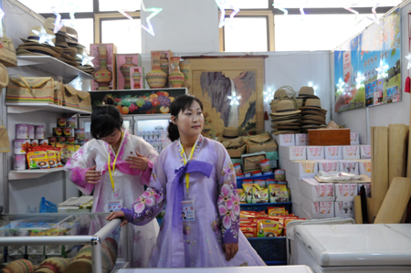 5月14日,兩名身著傳統(tǒng)服飾的婦女在朝鮮首都平壤舉行的第15屆平壤春季國際商品展覽會上。 第15屆平壤春季國際商品展覽會14日在平壤三大革命展示館開幕。來自朝鮮、中國、德國、英國、澳大利亞、意大利等16個(gè)國家和地區(qū)的270多家公司參展。展覽會將展出2100多種產(chǎn)品,包括機(jī)床、電子產(chǎn)品、輕工業(yè)產(chǎn)品、食品和醫(yī)藥制品、化學(xué)制品等。
