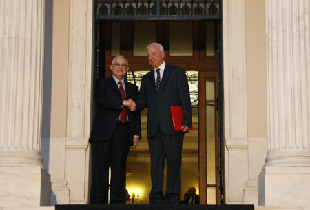 5月16日,在希臘首都雅典,帕納約蒂斯·皮克拉梅諾斯(右)與即將卸任的希臘總理帕帕季莫斯握手。 希臘最高行政法院主席帕納約蒂斯·皮克拉梅諾斯當(dāng)日宣誓就任希臘看守政府總理。新政府的唯一任務(wù)是領(lǐng)導(dǎo)國家在6月份再次舉行議會選舉。