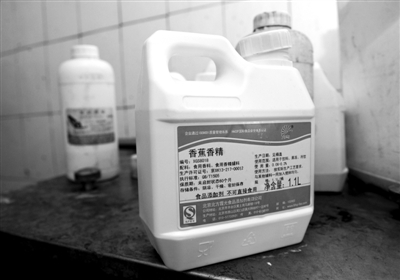 兩個(gè)配料桶之間,擺放著10多瓶各式各樣的食用香精,幾乎涵蓋了所有常見(jiàn)口味,“甜玉米味”、“草莓味”等。