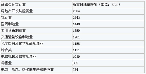 依據(jù)證監(jiān)會(huì)分類(lèi),房地產(chǎn)開(kāi)發(fā)與經(jīng)營(yíng)業(yè)成為最慷慨的行業(yè),2011年,它給獨(dú)立董事們總共支付了2564萬(wàn)元;第二名才是銀行業(yè),去年支付了2343萬(wàn)元;第三名為醫(yī)藥制造業(yè),支付了1443萬(wàn)元,后面依次才是專(zhuān)用設(shè)備制造業(yè)、交通運(yùn)輸設(shè)備制造業(yè)、化學(xué)、電器、零售業(yè)、電力等行業(yè)。