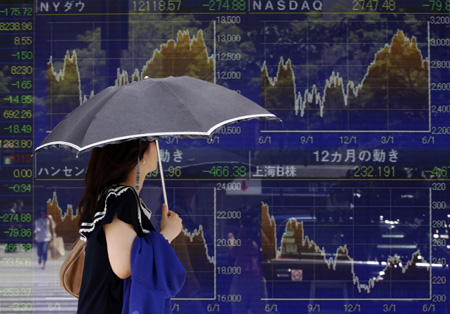 6月4日,在日本東京,一名女士從股指顯示屏前走過。受上周五美股全線重挫打壓,4日亞太地區(qū)主要股市普遍大跌。