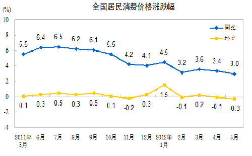 2012年5月份,全國居民消費(fèi)價(jià)格總水平同比上漲3.0%。其中,城市上漲3.0%,農(nóng)村上漲2.9%;食品價(jià)格上漲6.4%,非食品價(jià)格上漲1.4%;消費(fèi)品價(jià)格上漲3.6%,服務(wù)項(xiàng)目價(jià)格上漲1.7%。1-5月平均,全國居民消費(fèi)價(jià)格總水平比去年同期上漲3.5%。