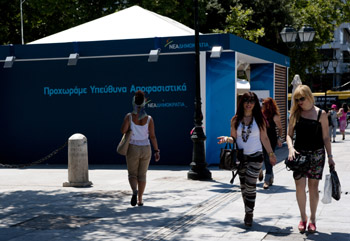 希臘首都雅典,民眾走過新民主黨選舉工作站。希臘將于6月17日舉行一個半月之內(nèi)的第二次議會選舉。這次選舉將在很大程度上決定希臘在歐元區(qū)的去留,乃至關(guān)系到整個歐元區(qū)的前途。記者