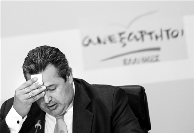 | 14日,希臘一政黨的領(lǐng)導(dǎo)人在一次新聞發(fā)布會(huì)上擦汗。希臘周日舉行二次大選,民眾恐慌大選后希臘退出歐元區(qū)。 |