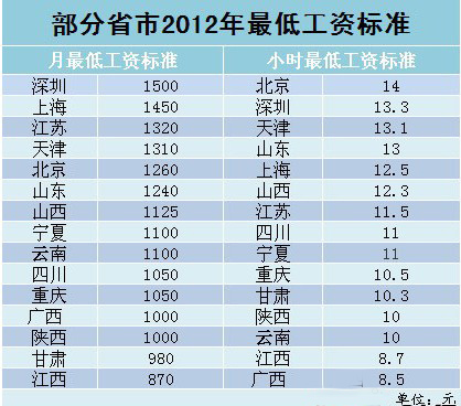 從2012年1月1日起到6月21日,北京、四川、江西、陜西、深圳、山東、上海、天津、廣西、寧夏、甘肅、山西、云南、重慶、江蘇這15個(gè)省市先后調(diào)整了最低工資標(biāo)準(zhǔn)。