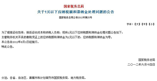 國家稅務(wù)總局近日發(fā)布公告,明確主管稅務(wù)機關(guān)開具的繳稅憑證上的應(yīng)納稅額和滯納金為1元以下的,應(yīng)納稅額和滯納金為零。公告自2012年8月1日起施行。