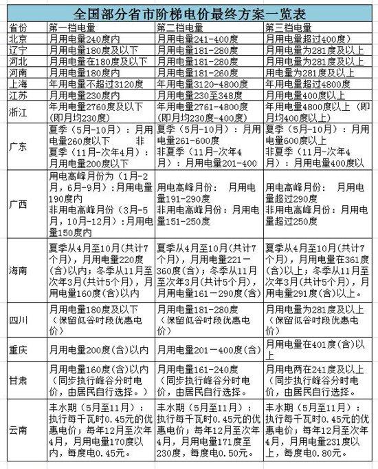 不過針對合表用戶及執(zhí)行居民電價(jià)的非居民用戶用電電價(jià)方面,浙江、甘肅等省市暫不執(zhí)行階梯電價(jià),部分省市出現(xiàn)不同幅度上調(diào)。據(jù)中新網(wǎng)報(bào)道四川對于合表居民用戶和執(zhí)行居民電價(jià)的非居民用戶,每度電在現(xiàn)行合表用戶電價(jià)基礎(chǔ)上,按國家規(guī)定順加0.024元執(zhí)行,即每度電0.5464元。重慶合表用戶目前暫不執(zhí)行居民階梯電價(jià),電價(jià)每度統(tǒng)一提高2分,即每度0.54元。云南網(wǎng)報(bào)道,合表居民用戶,以及執(zhí)行居民生活電價(jià)的非居民用戶,均按照每度0.51元執(zhí)行。
