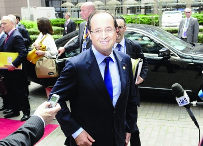 圖為默克爾(上)和奧朗德(下)分別抵達歐盟總部出席峰會。