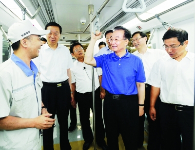 這是7月7日,溫家寶在南京浦鎮(zhèn)車輛有限公司生產(chǎn)車間與一線工人親切交談。
