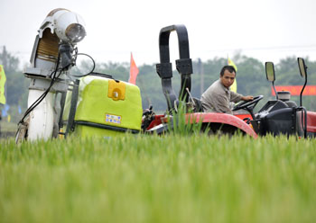 春暉農(nóng)機合作社的一位農(nóng)戶用“加農(nóng)炮”式噴霧器進行農(nóng)作。記者