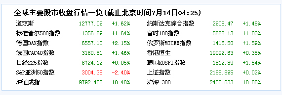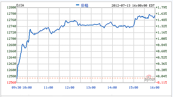 美東時(shí)間7月13日16:00(北京時(shí)間7月14日04:00),道瓊斯工業(yè)平均指數(shù)上漲203.82點(diǎn),報(bào)12,777.09點(diǎn),漲幅為1.62%;納斯達(dá)克(微博)綜合指數(shù)上漲42.28點(diǎn),報(bào)2,908.47點(diǎn),漲幅為1.48%;標(biāo)準(zhǔn)普爾500指數(shù)上漲22.02點(diǎn),報(bào)1,356.78點(diǎn),漲幅為1.65%。