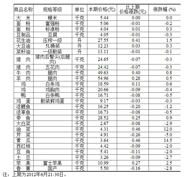 50個城市主要食品平均價格變動情況(2012年7月1-10日)