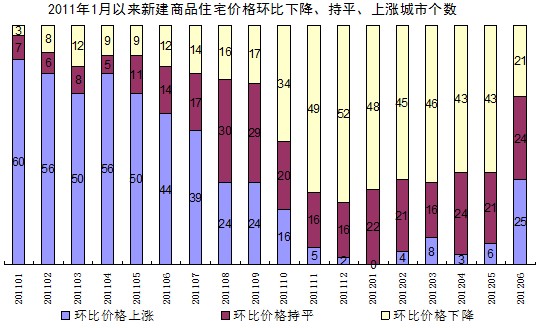 馬曉明說,同時也要看到,從環(huán)比數(shù)據(jù)看,新建商品住宅和二手住宅價格上漲的城市均有所增加。其中,新建商品住宅銷售價格環(huán)比上漲的城市有25個,持平的城市有24個,下降的城市有21個,環(huán)比上漲的城市個數(shù)比5月份增加了19個。二手住宅銷售價格環(huán)比上漲的城市有31個,持平的城市有20個,下降的城市有19個,環(huán)比上漲的城市個數(shù)比5月份增加了13個。一線城市中,北京、上海和廣州的新建商品住宅銷售價格分別上漲了0.3%、0.2%和0.2%。深圳雖然環(huán)比下降0.1%,但降幅比5月份收窄。北京、上海、廣州和深圳的二手住宅銷售價格分別上漲了0.2%、0.2%、0.5%和0.2%。