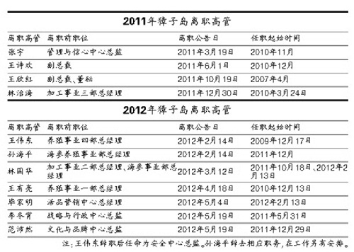 從2010年1月5日,獐子島人力資源中心總監(jiān)白長青、采購中心總監(jiān)趙韶翊離職開始,至2012年5月19日,戰(zhàn)略與行政中心總監(jiān)李冬霄、文化與品牌中心總監(jiān)范沛然離職,以及另有工作安排的孫海平,兩年多時間內(nèi)獐子島辭職的高管已經(jīng)達(dá)到14人。