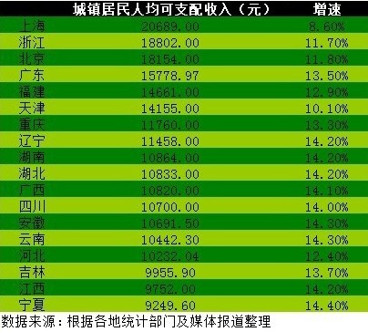 據(jù)記者統(tǒng)計,包括上海、浙江、北京、廣東、福建、天津在內(nèi)的六個省市居民人均收入超過了全國平均水平的12509元,其中收入領(lǐng)跑者上海高出全國平均水平8000多元。