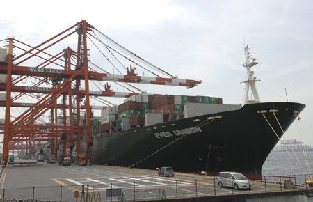 7月25日,一艘貨輪?吭谌毡緰|京大井集裝箱碼頭。 日本財(cái)務(wù)省25日公布的速報(bào)數(shù)據(jù)顯示,今年上半年日本出現(xiàn)2.9158萬(wàn)億日元(約合373億美元)貿(mào)易逆差,創(chuàng)有統(tǒng)計(jì)以來(lái)半年期貿(mào)易逆差新高。