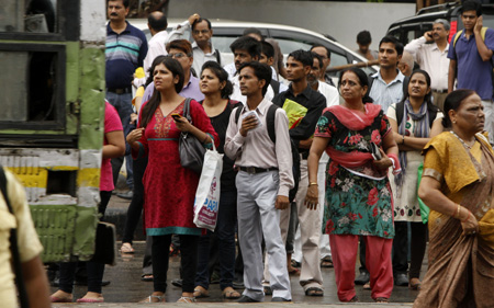 圖為7月31日,新德里的上班族們由于地鐵停運在地鐵站外等候公交車!