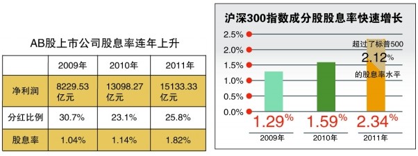 權(quán)威統(tǒng)計(jì)數(shù)據(jù)顯示,2009至2011年的三年間,AB股上市公司凈利潤(rùn)分別為8229.53億元、13098.27億元、15133.33億元;AB股公司分紅比例分別為30.7%、23.1%、25.8%;而其股息率則呈現(xiàn)連年上升,分別為1.04%、1.14%、1.82%,這一水平與境外主要成熟市場(chǎng)相比并不低。