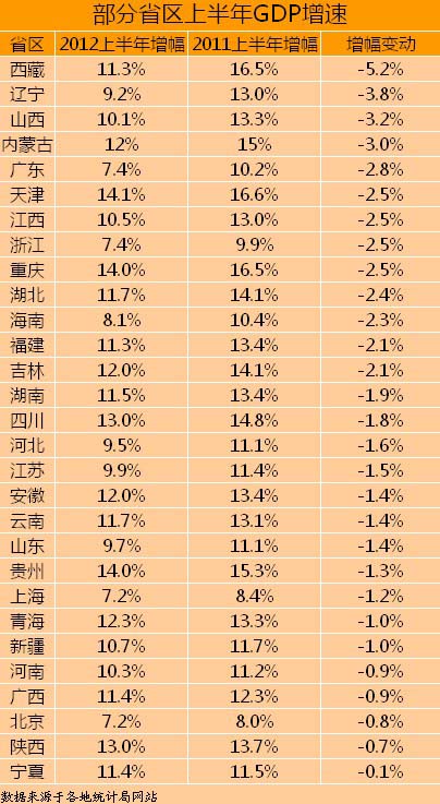 截至8月1日,除甘肅和黑龍江省之外,全國已有29個(gè)省(自治區(qū)、直轄市)份公布了2012年上半年GDP(國內(nèi)生產(chǎn)總值)增速。與2011年上半年相比,29個(gè)省份的GDP增速均出現(xiàn)了放緩。其中,西藏增幅下降最大,降幅達(dá)5.2個(gè)百分點(diǎn)。