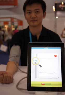 日前,蘋(píng)果產(chǎn)業(yè)鏈大會(huì)——Macworld | iWorld 2012數(shù)字亞洲博覽會(huì)在京舉行。記者發(fā)現(xiàn),與會(huì)中國(guó)企業(yè)大多處于利潤(rùn)空間較小的產(chǎn)業(yè)鏈下游。而業(yè)界人士指出,中國(guó)企業(yè)有望借助移動(dòng)互聯(lián)網(wǎng)的飛速發(fā)展,在蘋(píng)果產(chǎn)業(yè)鏈中獲得更高利潤(rùn),甚至顛覆整個(gè)產(chǎn)業(yè)鏈。圖為工作人員展示九安醫(yī)療電子股份有限公司開(kāi)發(fā)的“移動(dòng)互聯(lián)血壓計(jì)”。