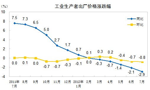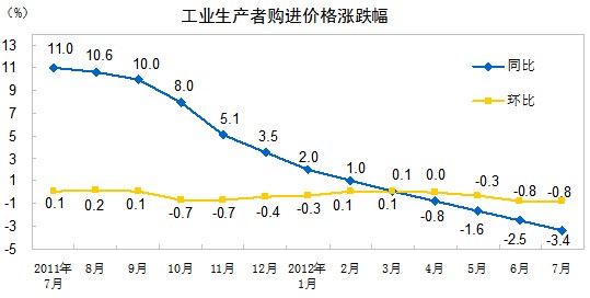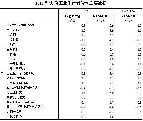 2012年7月份,全國(guó)工業(yè)生產(chǎn)者出廠價(jià)格同比下降2.9%,環(huán)比下降0.8%。工業(yè)生產(chǎn)者購進(jìn)價(jià)格同比下降3.4%,環(huán)比下降0.8%。1—7月平均,工業(yè)生產(chǎn)者出廠價(jià)格同比下降1.0%,工業(yè)生產(chǎn)者購進(jìn)價(jià)格同比下降0.8%。
