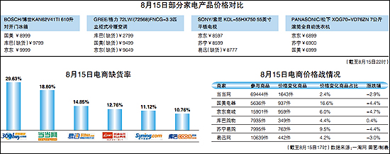 阿里巴巴旗下購(gòu)物比價(jià)搜索平臺(tái)一淘網(wǎng)監(jiān)測(cè)信息顯示,“8·15”當(dāng)天共監(jiān)測(cè)全網(wǎng)六大B2C商家網(wǎng)購(gòu)大家電商品11.7萬(wàn)余件。其中僅有5000多件商品價(jià)格有所下降,總占比僅4.2%。在宣布參加價(jià)格戰(zhàn)的商家中,國(guó)美電器官網(wǎng)的降價(jià)商品比例達(dá)到了16.6%,也是最實(shí)在最給力的商家。京東商城降價(jià)大家電的比例僅有6%。難怪有網(wǎng)友不斷隔空“喊”劉強(qiáng)東安排降價(jià)。