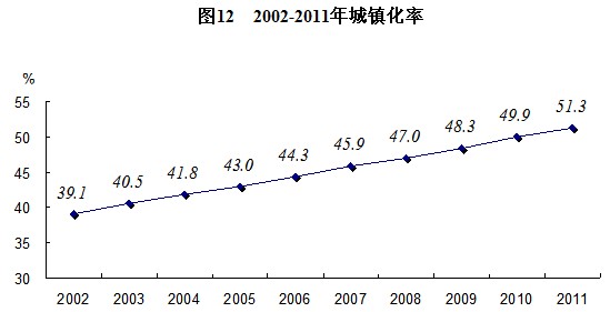 城鎮(zhèn)化是擴(kuò)大內(nèi)需的戰(zhàn)略重點(diǎn),也是社會(huì)轉(zhuǎn)型發(fā)展的重要標(biāo)志。黨的十六大以來,按照統(tǒng)籌規(guī)劃、合理布局、完善功能、以大帶小的原則,一批城市發(fā)展總體規(guī)劃制定實(shí)施,城市體系和功能不斷完善,人口和經(jīng)濟(jì)的集聚能力不斷增強(qiáng)。2011年,城鎮(zhèn)總?cè)丝诒?002年增長了37.6%,鄉(xiāng)村總?cè)丝跍p少了16.1%。2011年,我國城鎮(zhèn)化率首次突破50%,達(dá)到51.3%,比2002年提高12.2個(gè)百分點(diǎn),我國城鄉(xiāng)結(jié)構(gòu)發(fā)生歷史性變化。城鎮(zhèn)吸納就業(yè)的能力不斷增強(qiáng)。2011年,城鎮(zhèn)就業(yè)人員35914萬人,比2002年增加10755萬人,年均增加1195萬人。城鎮(zhèn)就業(yè)人員占全國就業(yè)總量的比重為47.0%,比2002年提高12.7個(gè)百分點(diǎn)。城鎮(zhèn)就業(yè)崗位的快速增加,帶動(dòng)了鄉(xiāng)村勞動(dòng)力不斷向城鎮(zhèn)轉(zhuǎn)移。