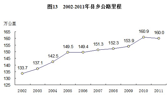 農(nóng)村面貌加快改善,城鄉(xiāng)經(jīng)濟(jì)社會(huì)發(fā)展一體化新格局逐步形成。黨的十六大以來的十年,是我國農(nóng)業(yè)農(nóng)村發(fā)生歷史性巨變、農(nóng)民得實(shí)惠最多的時(shí)期之一,是“三農(nóng)”發(fā)展的又一個(gè)“黃金期”。自黨中央作出社會(huì)主義新農(nóng)村建設(shè)部署以來,黨和政府始終堅(jiān)持把發(fā)展農(nóng)村公共事業(yè)作為縮小城鄉(xiāng)差距的重要抓手,持續(xù)加強(qiáng)農(nóng)村基礎(chǔ)設(shè)施建設(shè)和公共服務(wù),農(nóng)村水、電、燃?xì)、通訊等基礎(chǔ)設(shè)施建設(shè)進(jìn)一步加強(qiáng),農(nóng)村生產(chǎn)生活環(huán)境大大改善。2011年全國縣鄉(xiāng)公路里程達(dá)160萬公里,比2002年增加26萬公里,東部和中部“村村通”公路目標(biāo)已經(jīng)實(shí)現(xiàn),西部98%的行政村通了公路,全面完成國務(wù)院確定的“十一五”農(nóng)村公路建設(shè)目標(biāo)任務(wù)。通過實(shí)施飲水工程,解決了3.26億農(nóng)村人口的飲水安全問題。