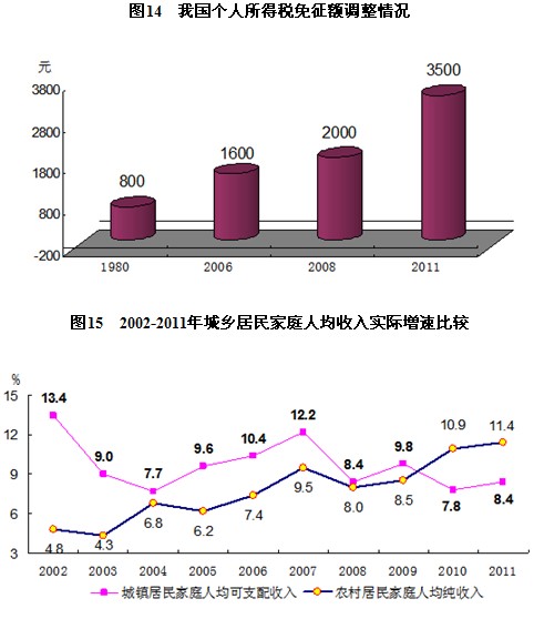 黨的十六大以來,黨中央堅(jiān)持民生優(yōu)先,把保障和改善民生作為一切工作的出發(fā)點(diǎn)和落腳點(diǎn),逐步推進(jìn)分配領(lǐng)域的各項(xiàng)改革,通過大力支持?jǐn)U大就業(yè),提高勞動(dòng)工資最低標(biāo)準(zhǔn),提高退休工資,不斷提高對低收入群體的轉(zhuǎn)移支付水平和覆蓋面,三次調(diào)高個(gè)人所得稅起征點(diǎn)等政策措施,千方百計(jì)拓寬增收渠道,提高居民收入水平。特別是把增加農(nóng)民收入作為農(nóng)村工作的中心任務(wù),促進(jìn)增產(chǎn)增收、優(yōu)質(zhì)增收、提價(jià)增收、務(wù)工增收、補(bǔ)貼增收,農(nóng)民收入實(shí)現(xiàn)了連續(xù)多年較快增長。2011年,城鎮(zhèn)居民人均可支配收入21810元,比2002年增長1.8倍,扣除價(jià)格因素,年均實(shí)際增長9.2%;農(nóng)村居民人均純收入6977元,比2002年增長1.8倍,扣除價(jià)格因素,年均實(shí)際增長8.1%。城鄉(xiāng)居民收入年均增速超過1979—2011年7.4%的年均增速,是歷史上增長最快的時(shí)期之一。收入持續(xù)增長,吃穿住用等均有了很大改善,日子越過越好,主要耐用消費(fèi)品擁有量大幅增長。2011年底,農(nóng)村居民家庭平均每百戶擁有電冰箱61.5臺,增長3.1倍;空調(diào)機(jī)22.6臺,增長8.9倍;擁有移動(dòng)電話179.7部,增長12.1倍。