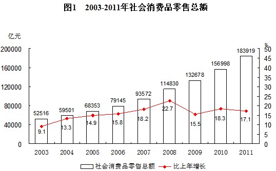 消費(fèi)需求穩(wěn)定增長,消費(fèi)結(jié)構(gòu)進(jìn)一步升級。在消費(fèi)方面,通過提高居民收入水平,加快社會(huì)保障制度建設(shè),積極實(shí)施家電、汽車下鄉(xiāng)等鼓勵(lì)消費(fèi)政策,扎實(shí)推進(jìn)萬村千鄉(xiāng)市場工程,努力釋放農(nóng)村消費(fèi)潛力,并大力規(guī)范市場秩序,改善消費(fèi)環(huán)境,居民消費(fèi)能力和消費(fèi)預(yù)期進(jìn)一步改善,市場銷售持續(xù)較快增長。2011年社會(huì)消費(fèi)品零售總額達(dá)183919億元,比2002年增長2.8倍,年均增長達(dá)16.1%。居民消費(fèi)從生存型向發(fā)展型轉(zhuǎn)變。2011年,城鎮(zhèn)居民家庭恩格爾系數(shù)為36.3%,比2002年降低了1.4個(gè)百分點(diǎn)。農(nóng)村居民家庭恩格爾系數(shù)為40.4%,比2002年降低了5.8個(gè)百分點(diǎn)。以汽車和旅游為例,2011年底,城鎮(zhèn)居民家庭平均每百戶擁有家用汽車18.6輛,比2002年底增加了17.7輛;2002至2011年,國內(nèi)旅游人數(shù)從2002年的8.8億人次增加到2011年的26.4億人次。