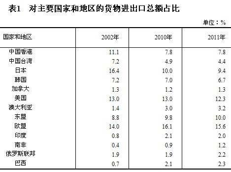 工業(yè)制成品出口比重進(jìn)一步提高,貿(mào)易多元化格局逐步形成,內(nèi)外需不平衡狀況逐步改善。在對外貿(mào)易方面,面對復(fù)雜多變的國內(nèi)外形勢,黨中央緊緊抓住加入世界貿(mào)易組織的機(jī)遇,積極應(yīng)對國際金融危機(jī)帶來的沖擊和挑戰(zhàn),堅(jiān)持統(tǒng)籌國內(nèi)國際兩個(gè)大局,不斷加快轉(zhuǎn)變對外經(jīng)濟(jì)發(fā)展方式,努力促進(jìn)國際收支基本平衡。進(jìn)出口貿(mào)易規(guī)模穩(wěn)步擴(kuò)大。2011年,貨物進(jìn)出口總額達(dá)到36421億美元,比2002年增長4.9倍,年均增長21.7%。進(jìn)出口商品結(jié)構(gòu)不斷優(yōu)化。在出口總額中,工業(yè)制成品占比由2002年的91.2%提高到2011年的94.7%;機(jī)電產(chǎn)品由48.2%提高到57.2%;高新技術(shù)產(chǎn)品由20.8%提高到28.9%。同時(shí)通過加大財(cái)稅支持、加強(qiáng)金融服務(wù)和提高貿(mào)易便利化水平等措施,積極擴(kuò)大進(jìn)口。先進(jìn)技術(shù)、設(shè)備、關(guān)鍵零部件進(jìn)口快速增長,大宗資源能源產(chǎn)品進(jìn)口規(guī)模不斷擴(kuò)大。2011年,機(jī)電產(chǎn)品進(jìn)口7533億美元,比2002年增長3.8倍;高新技術(shù)產(chǎn)品進(jìn)口4630億美元,增長4.6倍。鐵礦砂及其精礦進(jìn)口6.9億噸,比2002年增長5.2倍;原油進(jìn)口2.5億噸,增長2.7倍。從市場結(jié)構(gòu)看,中國與新興經(jīng)濟(jì)體貿(mào)易增長強(qiáng)勁。2002-2011年,與印度、俄羅斯、巴西、南非和東盟雙邊貿(mào)易占貨物進(jìn)出口總額的比重由12.7%上升至17.7%,上升了5個(gè)百分點(diǎn)。歐盟、美國、日本和香港市場占中國貨物進(jìn)出口總額的比重則由54.5%下降至45.0%,下降