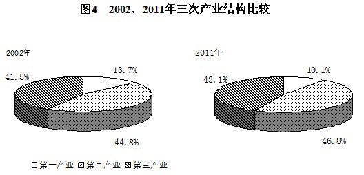黨的十六大以來,黨中央、國務(wù)院按照科學(xué)發(fā)展觀的要求,圍繞發(fā)展現(xiàn)代農(nóng)業(yè)、走新型工業(yè)化道路和促進(jìn)服務(wù)業(yè)快速發(fā)展的目標(biāo),大力推進(jìn)結(jié)構(gòu)調(diào)整,三次產(chǎn)業(yè)趨向協(xié)同發(fā)展。2003-2011年,第一產(chǎn)業(yè)年均增長4.6%,第二產(chǎn)業(yè)年均增長11.9%,第三產(chǎn)業(yè)年均增長11.1%,均保持較快發(fā)展態(tài)勢。經(jīng)濟(jì)增長由主要依靠工業(yè)帶動(dòng)向三次產(chǎn)業(yè)協(xié)同帶動(dòng)轉(zhuǎn)變。從三次產(chǎn)業(yè)結(jié)構(gòu)看,第一產(chǎn)業(yè)增加值占國內(nèi)生產(chǎn)總值比重明顯下降,從2002年的13.7%下降到2011年的10.1%,下降了3.6個(gè)百分點(diǎn);第二產(chǎn)業(yè)增加值占國內(nèi)生產(chǎn)總值比重從2002年的44.8%提高到2011年的46.8%,提高了2.0個(gè)百分點(diǎn);第三產(chǎn)業(yè)增加值占國內(nèi)生產(chǎn)總值的比重從2002年的41.5%提高到2011年的43.1%,提高1.6個(gè)百分點(diǎn)。