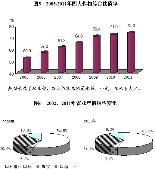 農(nóng)業(yè)生產(chǎn)穩(wěn)步發(fā)展,優(yōu)質(zhì)農(nóng)產(chǎn)品比重明顯上升,農(nóng)業(yè)基礎(chǔ)地位不斷穩(wěn)固。黨的十六大以來,黨中央、國務(wù)院確立了把解決好“三農(nóng)”問題作為全黨工作重中之重的戰(zhàn)略思想,制定了“工業(yè)反哺農(nóng)業(yè)、城市支持農(nóng)村”和“多予、少取、放活”的指導(dǎo)方針,部署了加快發(fā)展現(xiàn)代農(nóng)業(yè)、建設(shè)社會(huì)主義新農(nóng)村的戰(zhàn)略任務(wù),取消了農(nóng)業(yè)稅,實(shí)行了對農(nóng)、畜、林及草原等的直接補(bǔ)貼、良種補(bǔ)貼、農(nóng)機(jī)具購置補(bǔ)貼和農(nóng)資綜合補(bǔ)貼,全面放開糧食購銷,推進(jìn)集體林權(quán)制度改革,堅(jiān)持不懈地推進(jìn)農(nóng)業(yè)科技進(jìn)步,加快推進(jìn)現(xiàn)代農(nóng)業(yè)建設(shè),農(nóng)業(yè)生產(chǎn)穩(wěn)步發(fā)展,農(nóng)業(yè)基礎(chǔ)地位不斷穩(wěn)固。糧食生產(chǎn)扭轉(zhuǎn)了一度下滑局面,實(shí)現(xiàn)了“八連增”。2011年,糧食總產(chǎn)量達(dá)到57121萬噸,比2002年增長25.0%,年均增長2.5%,連續(xù)5年穩(wěn)定在5億噸以上,其他主要農(nóng)產(chǎn)品也穩(wěn)中有增。與此同時(shí),農(nóng)業(yè)結(jié)構(gòu)不斷優(yōu)化,優(yōu)質(zhì)農(nóng)產(chǎn)品比重明顯上升,規(guī);N養(yǎng)、區(qū)域化布局、標(biāo)準(zhǔn)化生產(chǎn)加速推進(jìn)。2011年水稻、小麥、玉米優(yōu)質(zhì)化率分別達(dá)到81.0%、74.3%和64.6%,分別比2005年提高16.3、25.5和27.7個(gè)百分點(diǎn)。大宗農(nóng)產(chǎn)品生產(chǎn)繼續(xù)向優(yōu)勢產(chǎn)區(qū)集中,13個(gè)糧食主產(chǎn)省對糧食增產(chǎn)的貢獻(xiàn)達(dá)到90%以上。農(nóng)業(yè)物質(zhì)技術(shù)裝備水平穩(wěn)步提高,農(nóng)田有效灌溉面積擴(kuò)大了7300多萬畝,農(nóng)作物耕種收綜合機(jī)械化率提高了18.6個(gè)百分點(diǎn)。2011年農(nóng)業(yè)科技貢獻(xiàn)率達(dá)到53.5%,有力支撐了農(nóng)業(yè)持續(xù)穩(wěn)定發(fā)展。