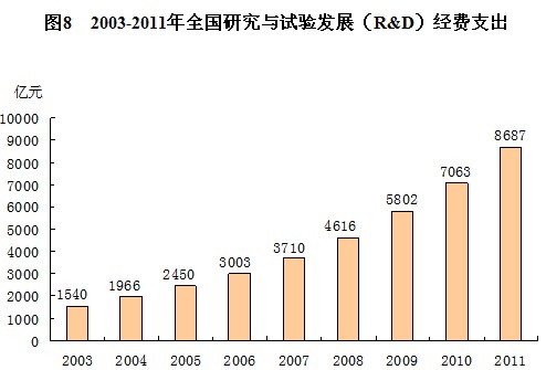 努力提高科技創(chuàng)新對經(jīng)濟(jì)發(fā)展的貢獻(xiàn),逐步擺脫經(jīng)濟(jì)發(fā)展對資源消耗和環(huán)境投入的過度依賴,是落實(shí)科學(xué)發(fā)展觀的重要內(nèi)涵。十六大以來,黨中央、國務(wù)院十分重視推進(jìn)科技創(chuàng)新,大力實(shí)施科技、教育、人才三項(xiàng)中長期發(fā)展規(guī)劃綱要?萍纪度氤掷m(xù)增加,科技發(fā)展成果豐碩。2011年,全國研究與試驗(yàn)發(fā)展(R&D)經(jīng)費(fèi)支出8687億元,比2002年增長5.7倍,占國內(nèi)生產(chǎn)總值的比重由1.07%上升到1.84%。2011年,研究與試驗(yàn)發(fā)展人員全時(shí)當(dāng)量[1]288.3萬人年,比2002年增長1.8倍。技術(shù)市場成交額4764億元,比2002年增長4.4倍。重要科學(xué)前沿和戰(zhàn)略必爭領(lǐng)域取得了一批重大創(chuàng)新成果。千萬億次超級計(jì)算機(jī)系統(tǒng)“天河一號”研制成功,百畝超級雜交稻試驗(yàn)田畝產(chǎn)突破900公斤,載人潛水器“蛟龍”號創(chuàng)下了7062米的下潛紀(jì)錄,嫦娥一號、二號探月衛(wèi)星成功發(fā)射,神舟九號載人航天飛行圓滿成功,特別是天宮一號目標(biāo)飛行器與神舟九號飛船順利載人交會(huì)對接,標(biāo)志著我國載人航天工程第二步戰(zhàn)略目標(biāo)取得了具有決定性意義的重要進(jìn)展。