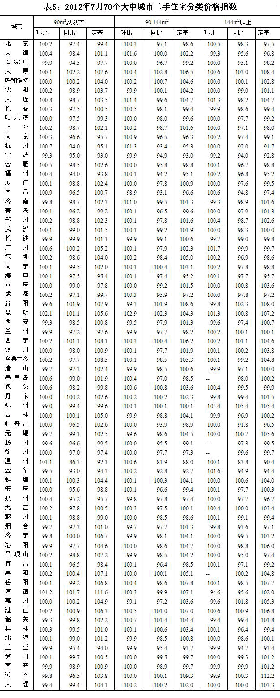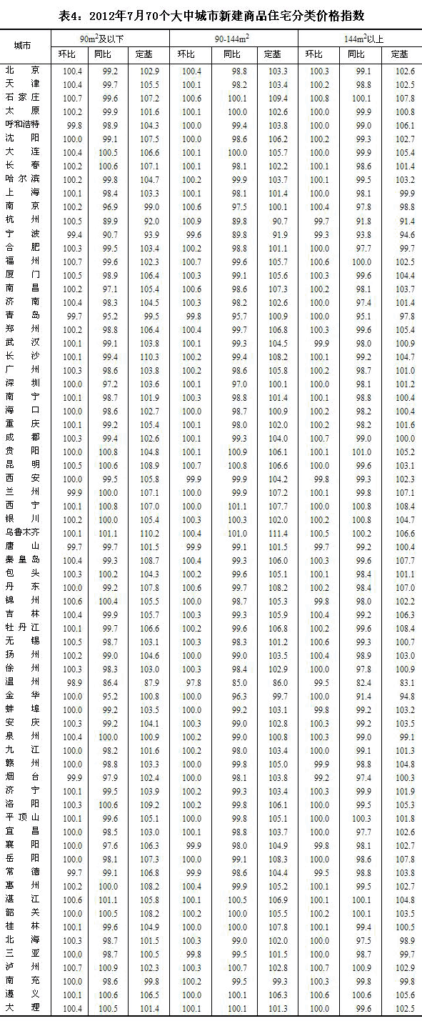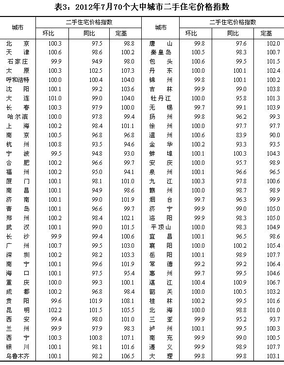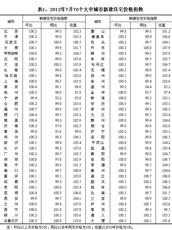 2012年7月份70個大中城市住宅銷售價格變動情況